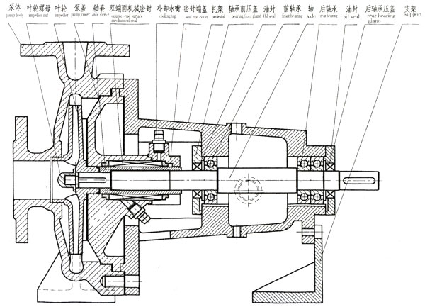 11、托架 12、黄油嘴 13、轴承后盖 14、机械密封动环 15、机械密封静环