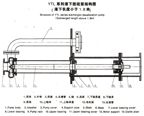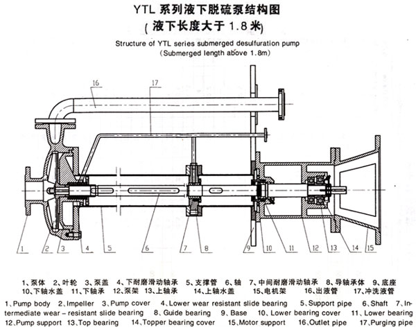 YTL系列液下脱硫泵,当泵的液下长度大于1.8米时,该泵为立式长轴液下离心泵,液下部分设有耐磨、耐腐蚀滑动轴承;该结构泵由泵体、叶轮、泵盖、下耐磨滑动轴承、中间磨滑动轴承、支撑管、泵架、轴等部件组成。