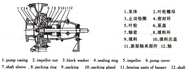 泵体和泵盖构成泵的工作室叶轮,轴和滚动轴承等构成泵的转子部件,悬架支撑着泵的转子部件,滚动轴承承受泵的轴向和径向力。泵的轴向密封是由填料压盖9、填料10和填料环8等组成(也可采用机械密封),以防止进气和大量漏水。